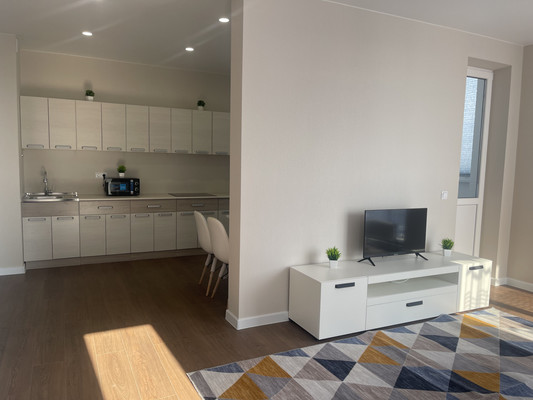 Квартира с новым ремонтом полностью укомплектована и готова принять новых жильцов. Внутри: раздельный санузел, 2 полноценные комнаты и большая кухня-гостиная. В наличии: телевизоры, стиральная машина, гарнитуры, вся мебель, двуспальная кровать,диван, шкафы и зоны хранения.